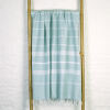 De Ottomania mooi gestreepte hamamdoeken in de kleur zeegroen zijn gemaakt van hydrofiel katoen waardoor ze zeer goed vocht opnemen. Deze lichtgewicht hamamdoek is ideaal als strandhanddoek, op reis, op de boot, naar het zwembad, sportschool of de sauna. De doek kan zeer compact worden opgevouwen en weegt maar 500 gram. Bovendien is de hammamdoek snel droog en goed te wassen. Daarom ideaal voor in de koffer, rugzak of strandtas. Prima te gebruiken als strandlaken of op een ligstoel.