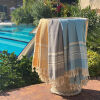 Si vous êtes un visiteur de sauna, une serviette de hammam ou fouta d'une taille de 100x180 ou 100x200 cm est assez grande. Vous utilisez généralement ce tissu dans le sauna comme enveloppement. Cette taille est également idéale à emporter avec vous pour la randonnée ou lorsque vous voyagez. Si vous allez à la plage ou à la piscine, une serviette de hammam, fouta ou drap de plage peut être un peu plus grande. Une serviette d'une taille de 100 x 200 cm convient, mais si vous trouvez plus confortable de vous allonger avec tout votre corps allongé sur un linge, alors la serviette de hammam Deniz de 100 x 230 cm est recommandée. Si vous allez utiliser un lit de plage, la housse de lit de plage est Double Diamondtrès recherché. Vous enroulez une couverture de lit de plage autour de la tête de votre lit de plage et le vent ne souffle pas sur votre lit de plage. Les couvre-lits de plage ont une longueur qui couvre tout votre lit de plage.